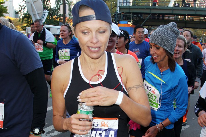 Pamela Anderson drinks some water after finishing the New York City Marathon.